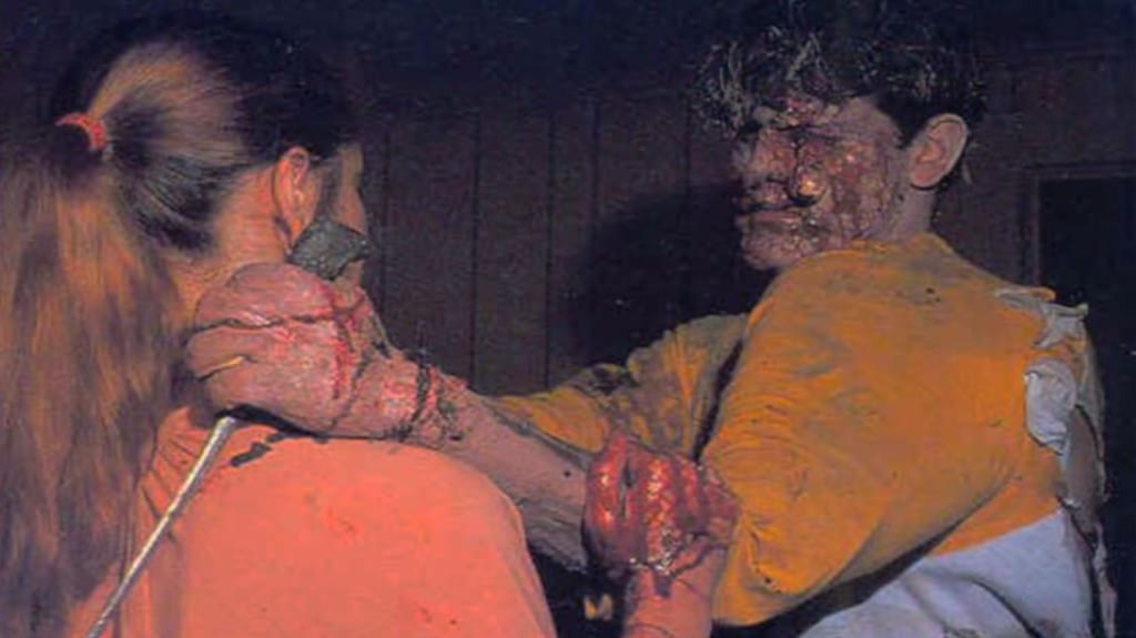 Bruce Campbell plays Bruce. Ellen Sandweiss plays Ellen. Scott Spiegel plays Scotty. Mary Valenti plays Shelly. Character naming was clearly not a top priority. What mattered was enthusiasm, gallons of fake blood, and Raimi’s now legendary determination to get the shot no matter what. If a window needed to be blacked out, they did it with bin liners. If a demon effect needed to be created, they raided the nearest make up store like desperate parents on Halloween night. If Bruce Campbell required hours of make up to transform into a possessed ghoul, he simply slept in it because removing it would take too long. You know a production is rough when the lead actor wakes up unsure if his face has permanently changed shape.