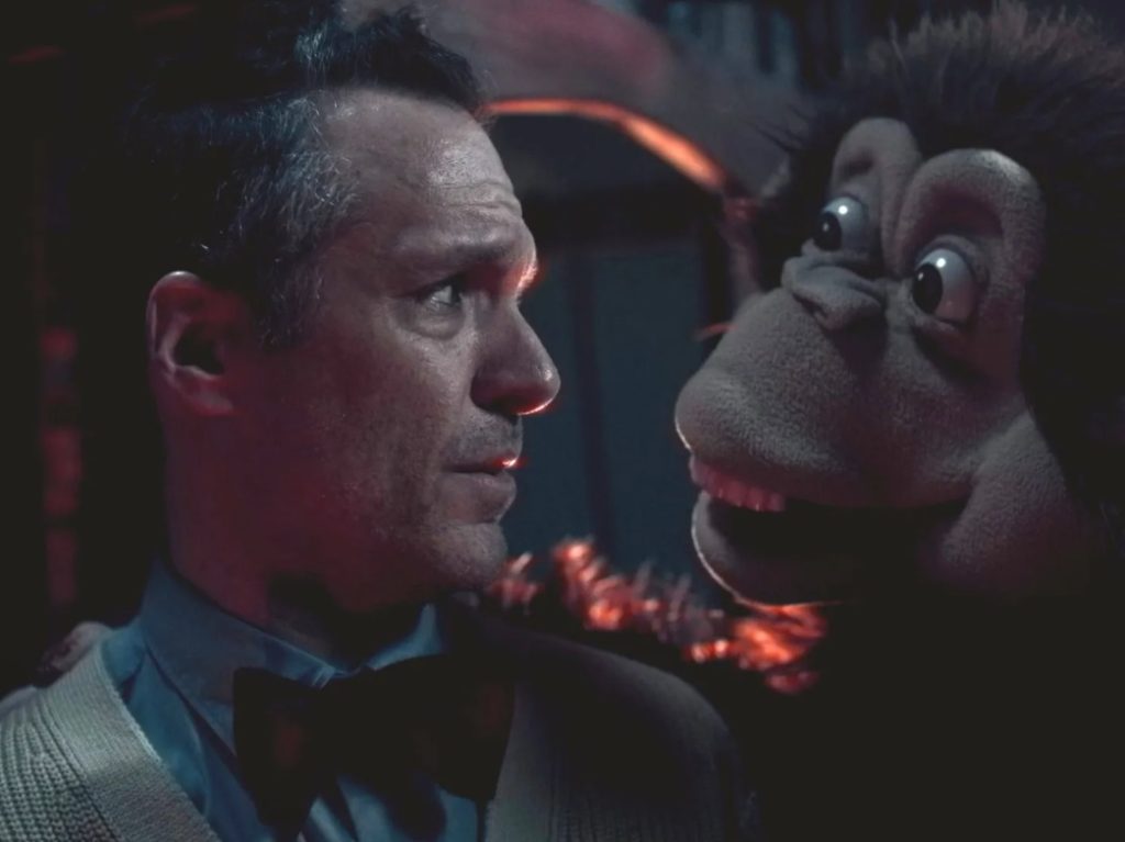 Front and centre is the unsettling presence of the puppets themselves. Rather than serving as harmless companions, they become antagonistic forces, their behaviour increasingly erratic and threatening. The trailer suggests a slow escalation rather than immediate chaos, allowing tension to build as the host begins to question both his surroundings and his own sanity.