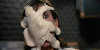 The film blends horror, satire, and absurd comedy. In one scene, a man’s face is torn apart as The Stuff bursts from his skull, while in another, entire rooms are engulfed by the goo. Perhaps most memorably, victims spew the dessert uncontrollably, their bodies collapsing into husks as the ooze slithers away to find its next host.