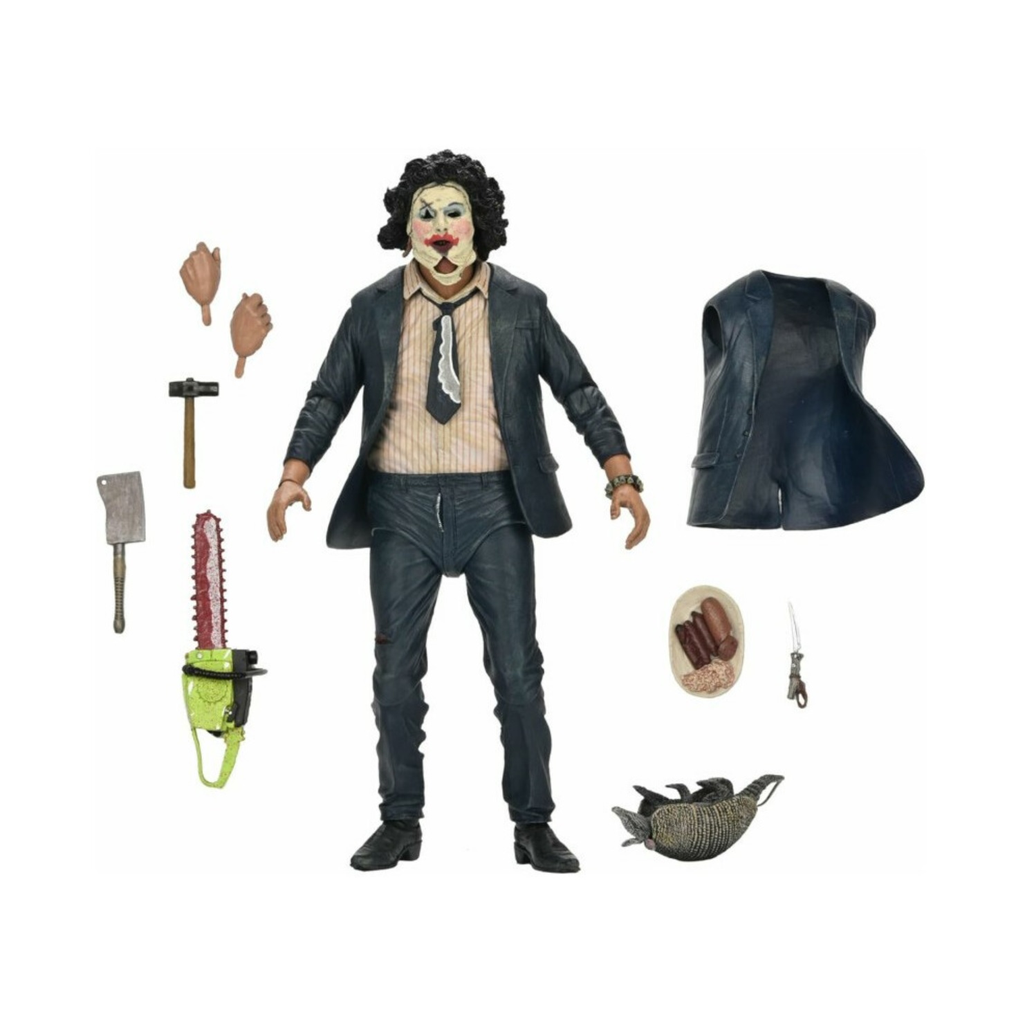 The figure includes a variety of accessories: interchangeable hands, chainsaw, armadillo, knife, bracelet, small hammer, cleaver, and a plate of meat. Packaged in a collector-friendly window box with an opening front flap, it’s the perfect tribute to a horror legend.