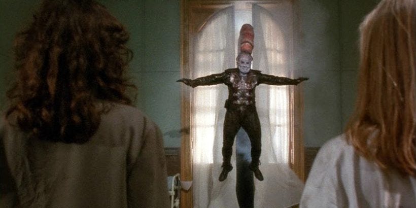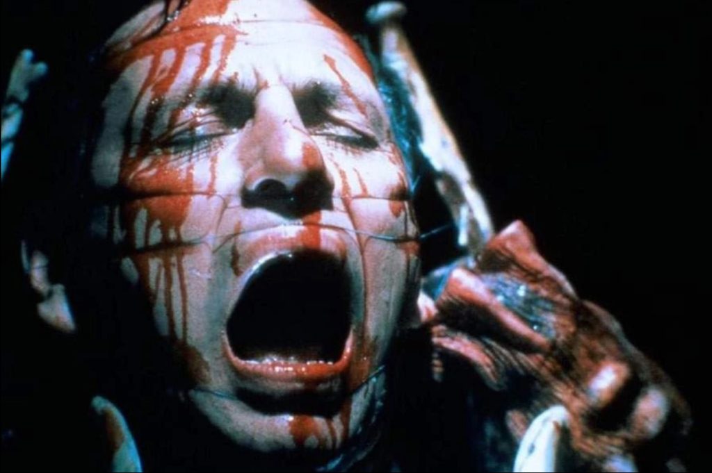 When Kirsty Cotton, survivor of the original massacre, is brought to Channard’s asylum claiming that her stepmother Julia Cotton has returned from the dead, Channard sees an opportunity to test his theories. He retrieves the blood-soaked mattress from the Cotton house — the same one Julia died upon — and sacrifices one of his own patients upon it. In a scene of shrieking horror, Julia’s skinless corpse erupts from the mattress, reborn in a spray of blood and sinew.