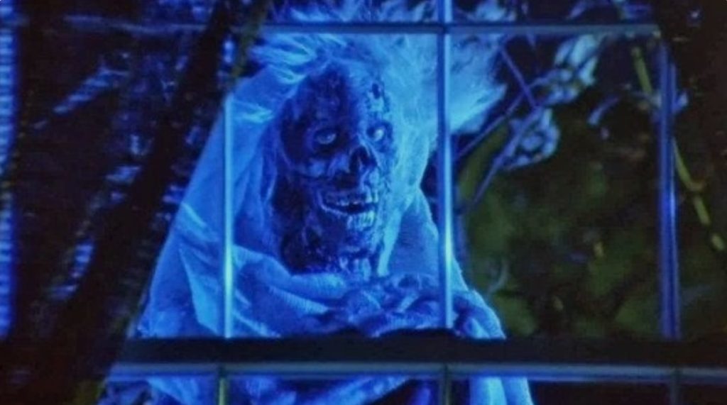 The Creep first appears as a hooded, skeletal figure who emerges at the window of a young boy named Billy, presenting a series of terrifying stories from the Creepshow comic. He does not speak, instead cackling and communicating through the comic’s text. In the film’s closing moments, his influence extends beyond narration, as Billy uses a voodoo doll ordered from the comic to exact revenge on his abusive father. The Creep is implied to be the catalyst behind this supernatural retribution, blurring the line between storyteller and participant.
